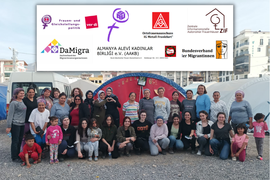 Almanya’da 7 kadın örgütü Hatay İskenderun’da Ekmek ve Gül, Emek Partisi, Rotary Kulübü ve Bir Tek Sen, Gıda İş, İletişim İş, ODTÜ Mezunlar Derneği’nin depremzedeler için kurduğu çadırların ve Ekmek ve Gül’ün kadın ve çocuklar için etkinlik çadırlarının, sağlık ve danışma çadırının, içinde yardım malzemelerinin olduğu deponun AFAD tarafından kaldırılmasına karşı açıklama yaptı.