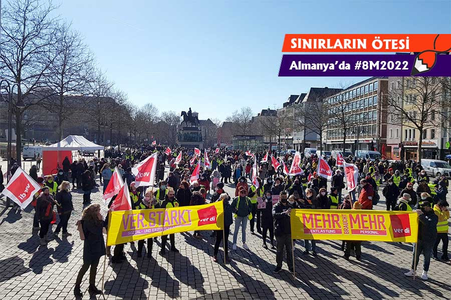 Almanya’nın birçok şehrinde gerçekleştirilen 8 Mart eylem ve kutlamalarında kadınlar, savaşa, yoksulluğa, eşitsizliğe, ırkçılık ve cinsiyetçiliğe karşı talepleriyle sokaklara döküldüler. 8 Mart Dünya Emekçi Kadınlar Günü, sabahın erken saatlerinde birçok şehirde Ver.di grevleriyle başladı. Sosyal hizmetler ve eğitim iş kolunda binlerce emekçi greve çıktı. Ver.di’nin yanı sıra eğitim iş kolunda örgütlü ve toplu iş sözleşmelerine iştirak eden GEW Sendikası da üyelerini greve çağırdı. Hamburg, Hannover, Köln, Kassel, Göttingen, Stuttgart, Gelsenkirchen, Frankfurt, Mannheim Düsseldorf ve daha birçok şehirde kitlesel eylemler düzenlendi. Almanya genelinde binlerce kreş ve sosyal kurum kapalı kaldı. İlki 25 Şubat’ta yapılan toplu sözleşme görüşmelerin ikinci turu 21-22 Mart tarihlerinde yapılacak.