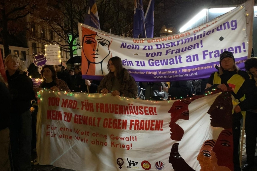 Hamburg’da, Kadına Yönelik Şiddetle Mücadele Günü’nde çok sayıda eylem yapıldı. Saat 15.00’te Alman Sendikalar Birliği (DGB) binası önünde sendikaların çağrısıyla yapılan mitingde DGB Hamburg Başkanı ve Hamburg Sosyal İşler Bakanı şiddetten korunma yasasının çıkarılması, işyerlerinde ücret eşitliği ve şiddete karşı önlemler ve mülteci kadınların korunması içerikli konuşmalar yaptılar. Saat 16.00’da Altona Alma Wartenberg Platz’da Anti Femizid Netzwerk, aynı yerde 17.00’de içinde Göçmen Kadınlar Birliği’nin de bulunduğu 8 Mart İttifakı birer miting düzenledi. Göçmen Kadınlar Birliği adına yapılan konuşmada savaşa, şiddete, eşitsizliğe karşı mücadele çağrısı yapıldı. Daha sonra Anti Femizid Netzwerk ve 8 Mart İttifakı katılımcıları ortak bir yürüyüş yaptılar.