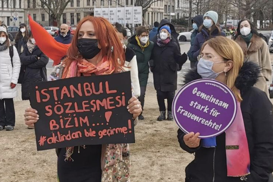 Cumhurbaşkanı Erdoğan'ın İstanbul Sözleşmesi’nden çekilme kararına karşı Münih’te yaşayan Türkiyeli kadınların ve sivil toplum örgütlerinin katılımıyla gerçekleştirilen eylemde kadınlar tepkilerini ve taleplerini konuşmalarla, dövizlerle ve sloganlarla dile getirdiler. Göçmen Kadınlar Birliği adına konuşan Tülin Çokdeğerli “Bu kararla bir gecede milyonlarca kadın bir erkeğin kararına kurban edildi. Kadına şiddet bugün Türkiye’nin bir gerçeği. Bu kararla kadın cinayetleri artacak ve failleri salınacak. Türkiye on yıl önce bu karara ilk imza atan ülkeydi ve devlet bununla övünmüştü. Şimdi ise bu kararla devlet bir sonraki seçimde iktidarı için en gerici çevreleri etrafında toplamaya çalışıyor. Bugün ülkede gerçek muhalefet suç sayılıyor ve siyasetçiler tutuklanıyor. Öğrenciler kriminalize ediliyor, ikinci büyük muhalefet partisi HDP yasaklanmaya çalışılıyor.
