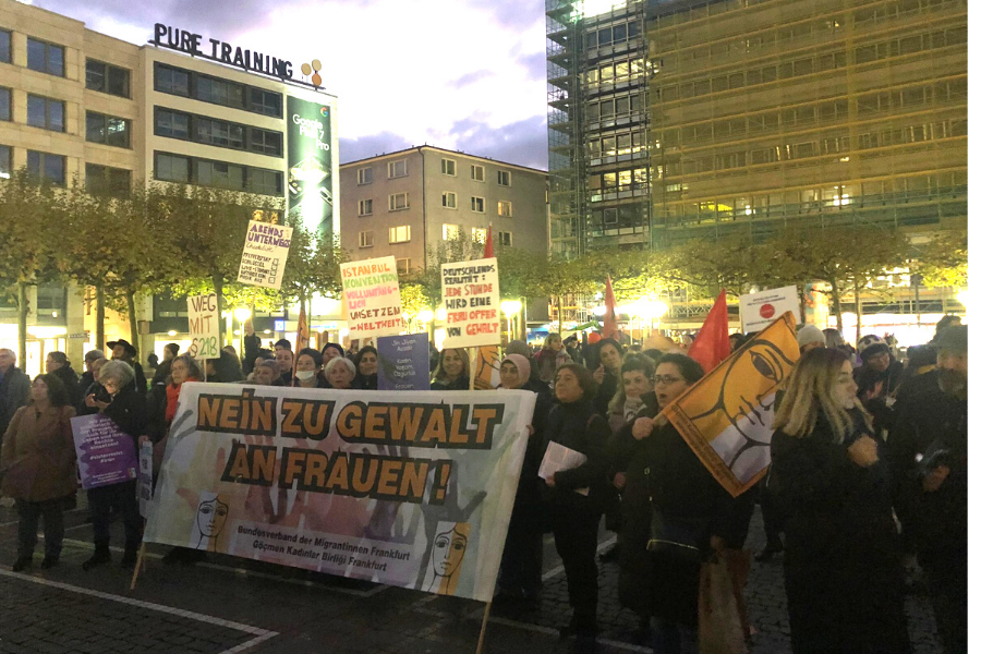 Frankfurt'ta yapılan miting ve yürüyüşe yaklaşık bin kişi katıldı. Yürüyüşte ağırlıklı olarak “Saat başı bir kadın şiddete uğruyor”, “Madde 218 kaldırılsın“, “Kadına yönelik şiddete hayır“ sloganları atıldı. Frankfurt Göçmen Kadınlar Derneği kadın korosu da yürüyüşte sahne aldı ve seslendirdikleri parçadan sonra “Jin Jiyan azadi!" sloganı atıldı.