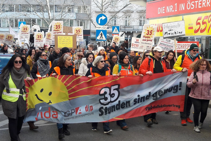 Avusturya’da özel sağlık ve sosyal hizmetler alanında çalışan çoğu kadın 3 bin emekçi, toplu sözleşme görüşmelerinde ilerleme sağlanamaması üzerine iki günlük uyarı grevinde.