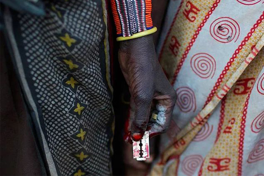 Kenyalı Bishara kadın sünnetine karşı kampanya yürütüyor. Elindeki kağıtta "Bıçağınızı ve jiletinizi bırakın. Kadın Sünnetine Hayır" yazıyor.