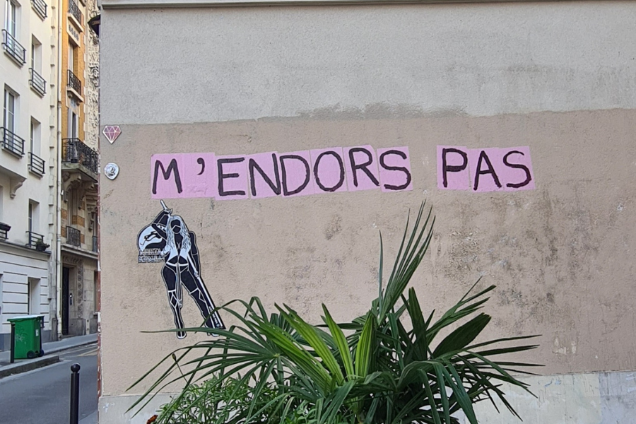 Kapak fotoğrafı: Duvar yazısında Gisèle Pelicot'un yaşadıklarına referans verilerek Fransızca "uykuya dalma" yazıyor.