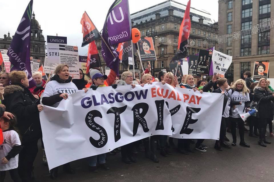 8 binden fazla kadın işçi, 1970 yılında “Eşit ücret” yasasının yürürlüğe girmesinden bu yana yapılan en büyük ve önemli bir grev ile, İskoçya’nın en büyük kenti Glasgow’da yaşamı durma noktasına getirdi.