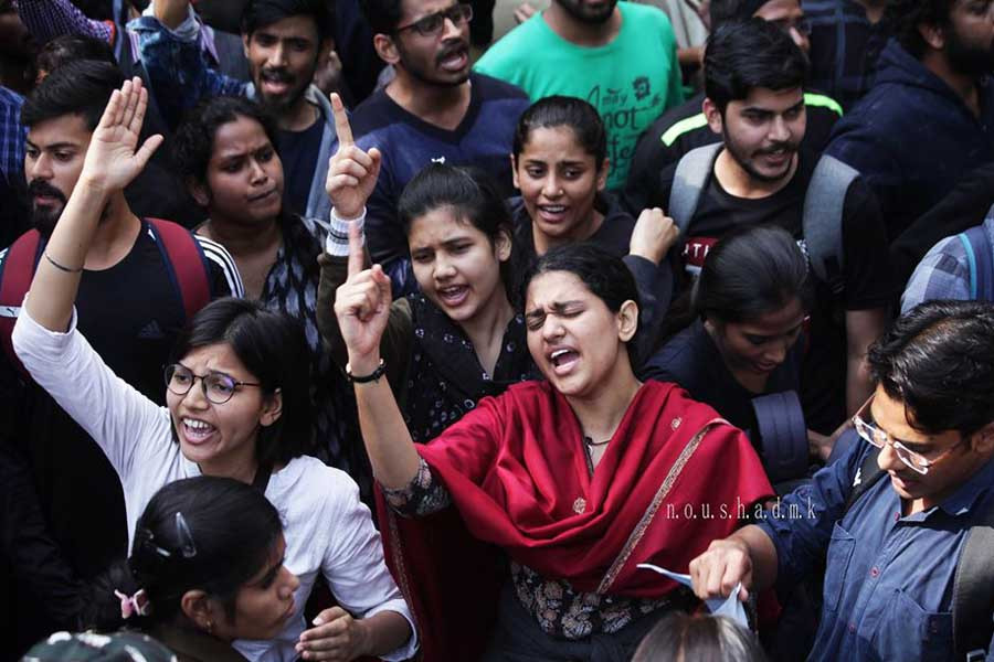 The impact of the JNU protests in 2016 was crucial — with the help of the jingoist media, the entire country began to perceive JNU students as anti-national, needlessly critical, and a burden on taxpayer money. This was aided by an ongoing devaluation of social sciences and an increasing preference for engineering and business education in a neoliberalized economy. Why do students need to study for 8 years? Why don’t these students have jobs already? Why are they constantly criticizing the government? Are they funded by terrorist organizations? Questions like these began to circulate on social media and an increasingly hateful environment was nurtured. Female students from JNU were alleged to be loose in character. There were also several instances of violent attacks on certain JNU students who had been at the face of the struggle.