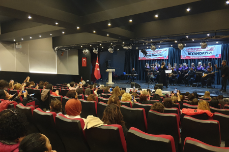 İZELMAN'da çalışan kadın işçiler, 'Yaşamak ve yaşatmak için bütün kadınlar omuz omuza' diyerek 25 Kasım etkinliğinde bir araya geldi.