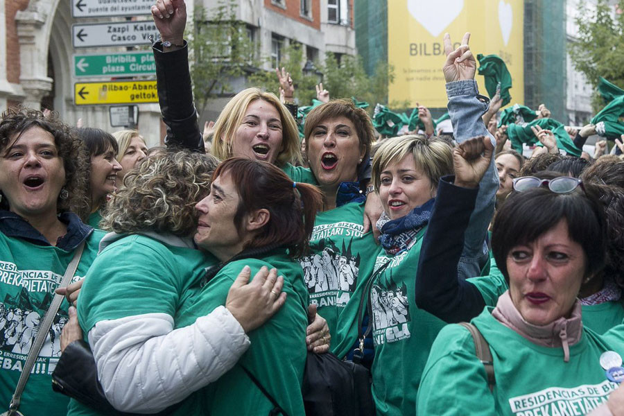 İspanya’nın kuzeyindeki Bask Özerk Bölgesinde bulunan Bizcaia kentindeki yaşlı bakım merkezleri çalışanı 5 bin kadın, sektörün üç büyük patronuna (Gesca, Elbe ve Lares şirketleri) karşı 370 gün boyunca sendikaları ELA ile birlikte örgütledikleri grevler ve protestolarla verdikleri uzun mücadeleyi kazandılar. Bakım işçilerinin maaşlarına her yıl farklı miktarda olmak üzere üç yıl boyunca aylık toplam 140 avro zam yapıldı ve asgari ücret seviyesi 1200 avroya yükseltildi. Çalışma saatleri ise 35 saat olarak belirlendi. İş kazası ya da hastalık gibi nedenlerle çalışmaya ara verenlerin maaşlarında kesinti yapılamayacağı maddesi de sözleşmeye girdi. Sözleşme 2020 yılına kadar geçerli olacak.“Bizcaia’nın en uzun grevi”ni gerçekleştiren kadın işçiler yayımladıkları bildiride “Bu bir kadın greviydi. Sendikal hareket tarihinin önemli bir sayfasını yazdığımıza inanıyoruz” dediler.