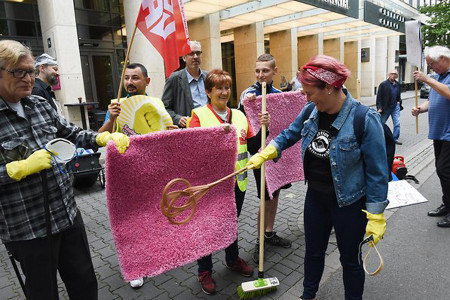 Düşük ücretlerle kötü koşullarda lüks otellerde çalışan temizlik işçisi kadınlar ‘pislik’ olarak nitelendirdikleri sömürüyü halı altına süpürerek patronlara “İşte siz bunu yapıyorsunuz!” dedi.