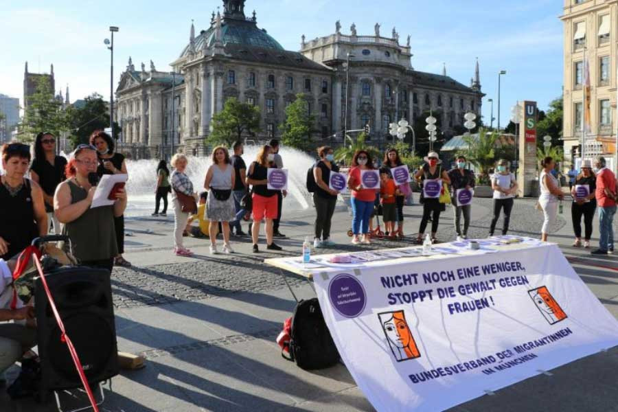 Kadına yönelik şiddet, kadın cinayetleri ve Türkiye’nin İstanbul Sözleşmesi’nden ayrılma girişimine karşı Münih Göçmen Kadınlar Birliği değişik kadın örgütlerinden kadınların ve dayanışma amaçlı gelen erkeklerin de katılımıyla bir eylem gerçekleştirdi. Yapılan konuşmalarda bir yandan kadına yönelik şiddet protesto edilirken diğer yandan da İstanbul Sözleşmesi hakkında bilgi verildi. Sözleşmenin kadına yönelik şiddette caydırıcı yaptırımları olduğundan bahsedildi.