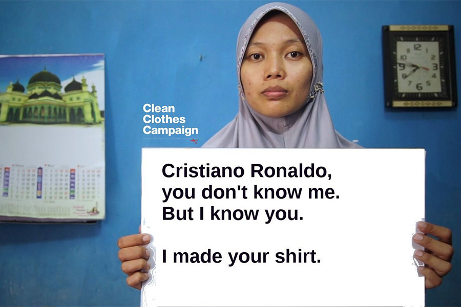 “Ücretler konusunda yeni bir protokol istiyoruz. Markalar alım pratiklerini değiştirmeliler çünkü bu durum çalışma koşullarını etkiliyor. Endonezya’daki bir işçinin parça başı aldığı ücret, ürettiği bir tişörtün ancak yüzde 1’i kadar. Ücretlerin biraz artırılması bana mantıklı geliyor, değil mi? Ama spor giyim markaları şimdiye kadar anlaşmayı reddettiler.”* Resimde: Cristiano Ronaldo, sen beni bilmiyorsun. Ama ben seni biliyorum. Senin tişörtünü ben yaptım.